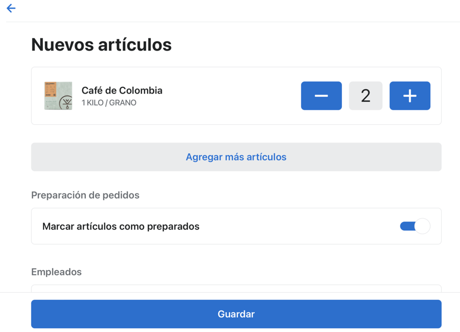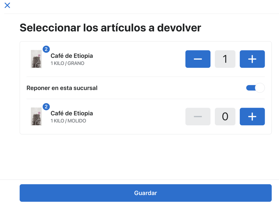 Seleccionamos el producto y la cantidad que queremos cambiar, asegurándonos de que "reponer en esta sucursal" esté activado, y luego guardamos.