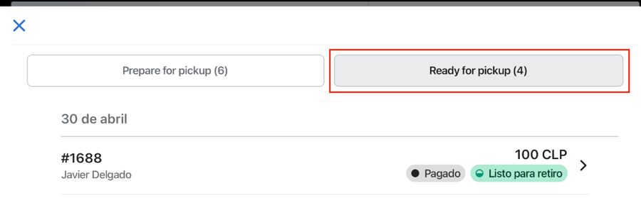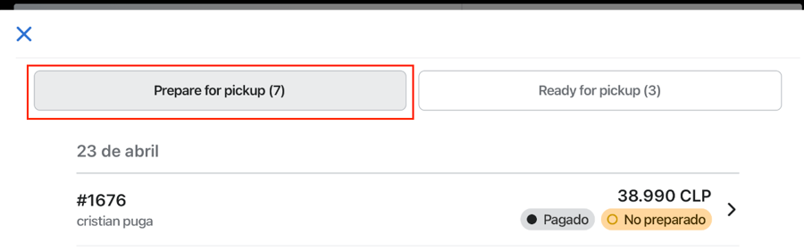 En la sección "Prepare for pickup" estarán los pedidos que debemos preparar.